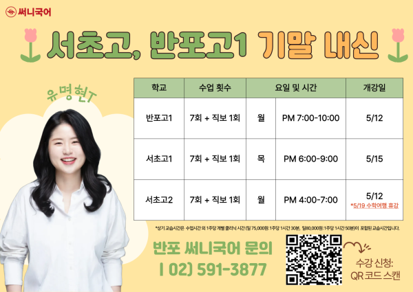 2025 유명현T 서초고, 반포고 기말 내신 시간표 2025-04-25 최고관리자 0 1345 2025.04.25 09:08 수강신청 문의: 02-591-3877 / 02-591-3878